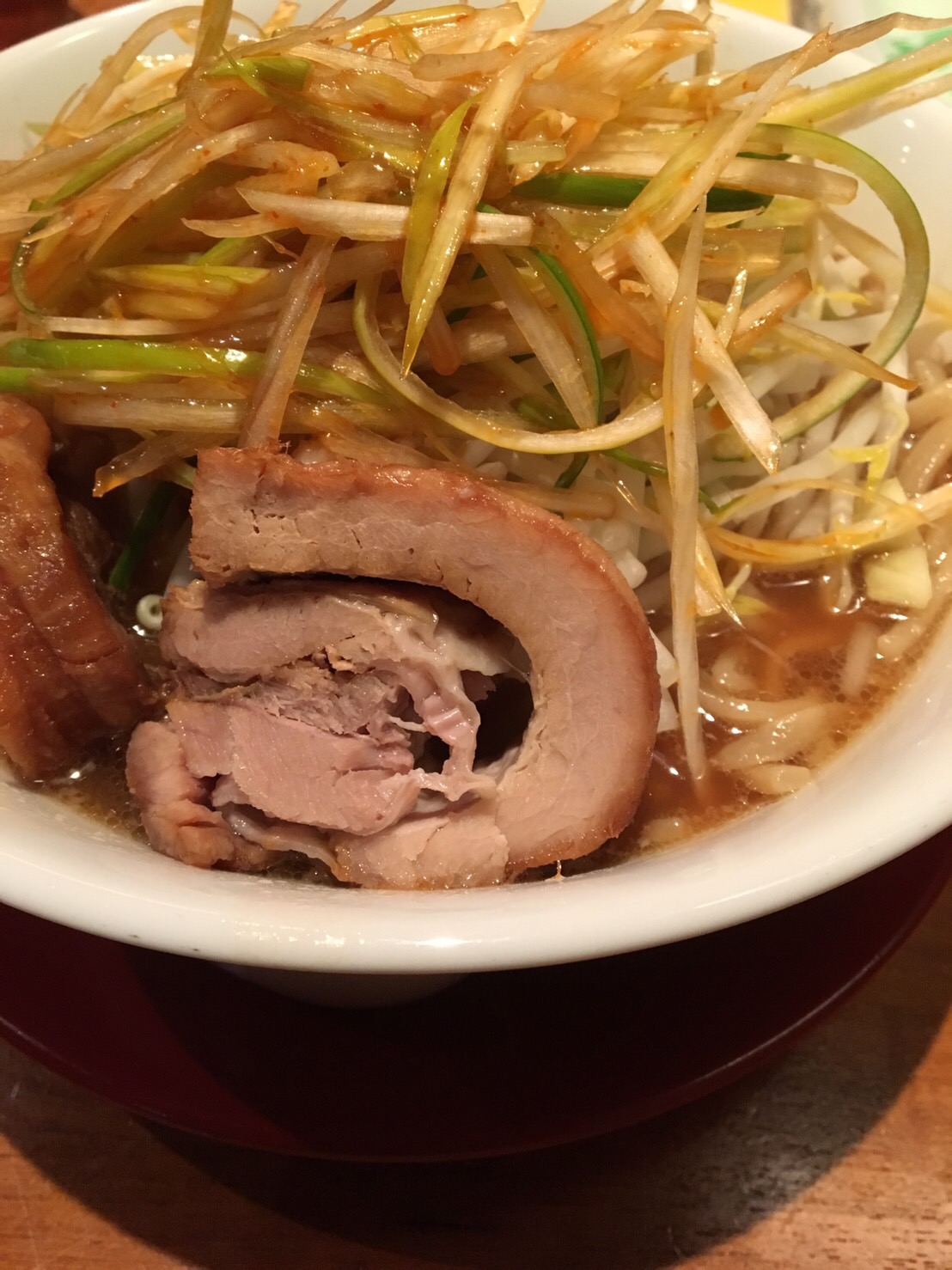 濃厚豚骨醤油にキャベツ多めの野菜とネギをトッピングしてもらいました!