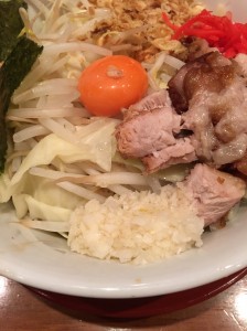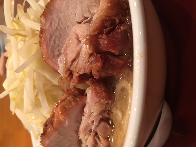 こちらのお店はいわゆる「二郎系」でたっぷりの野菜、極太麺、背脂が楽しめます