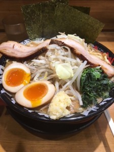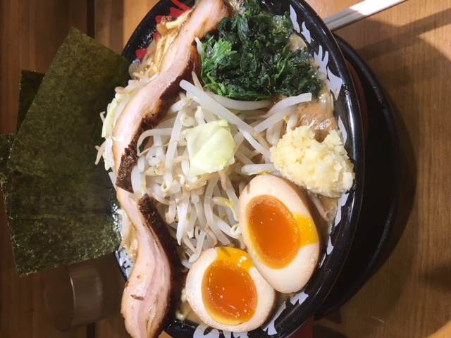たっぷりの茹野菜と刻みニンニク、そして家系らしく海苔とほうれん草、さらに大ぶりなチャーシューがトッピングされています(^^♪味玉はいただいたトッピング券で付けていただきました。